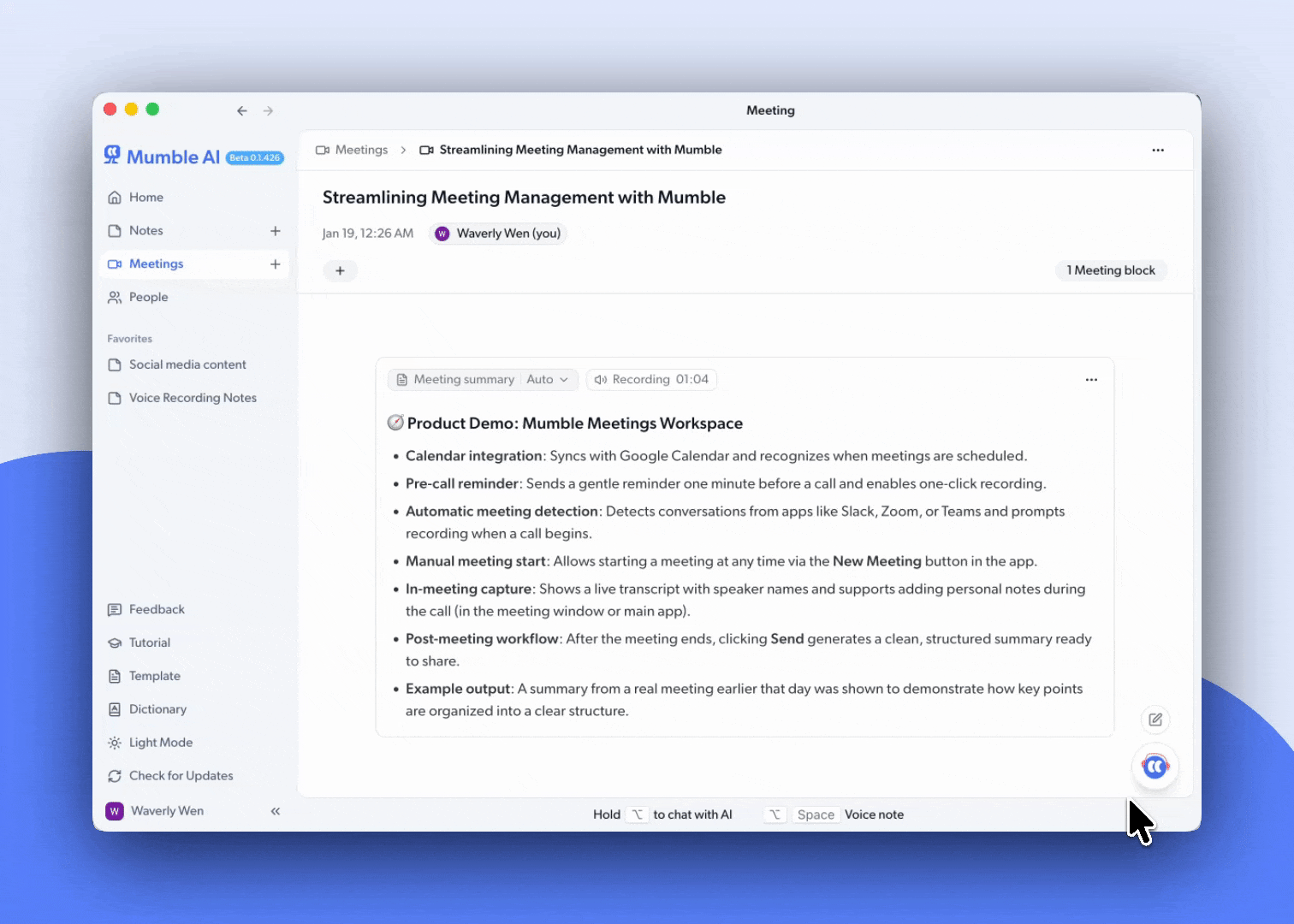 AI Chat. After the meeting, chat with Mumble to turn your notes into polished summaries, then share with your team.
